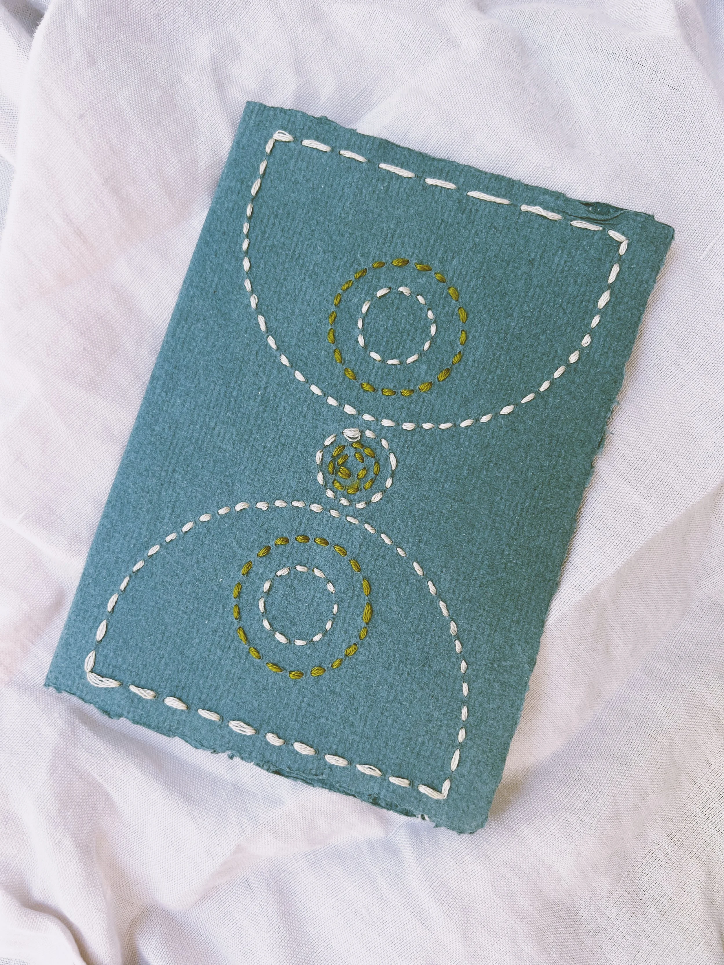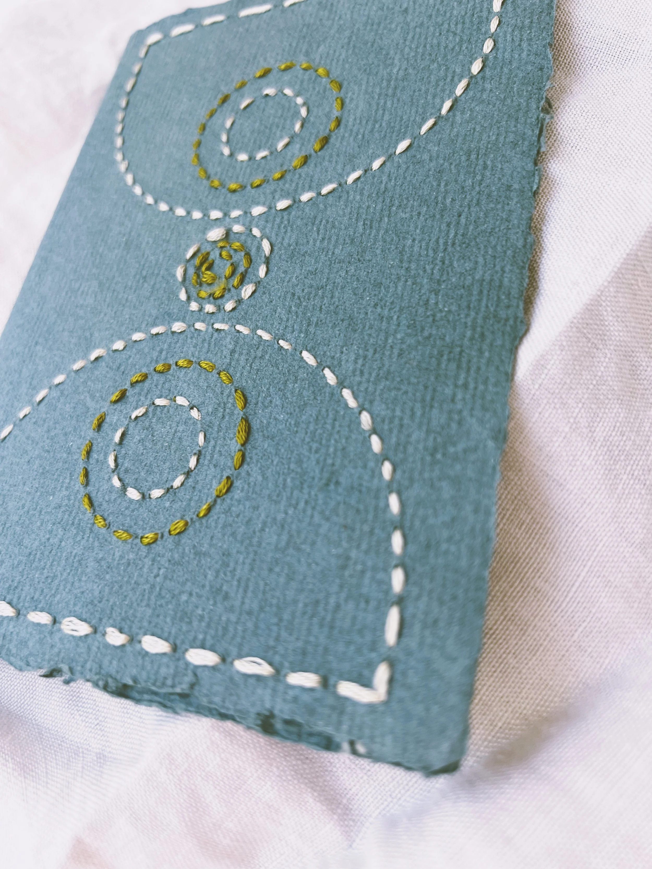 Each card has hand sewn with cotton threads on a hand made recycled paper. Besides using it for seasonal greetings, you can frame it as an art piece.